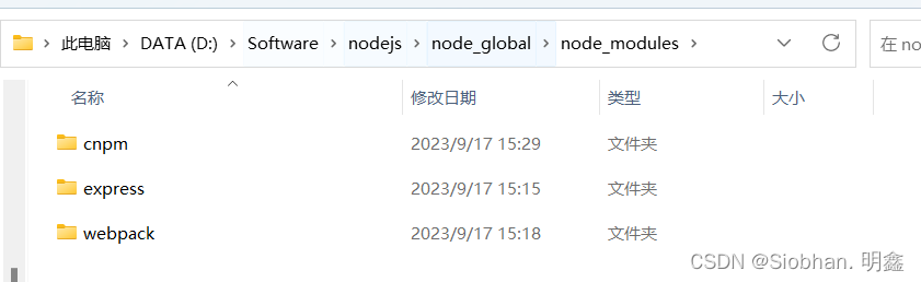 上面所安装的cnpm、express会出现在【node_global】下的【node_modules】文件夹里