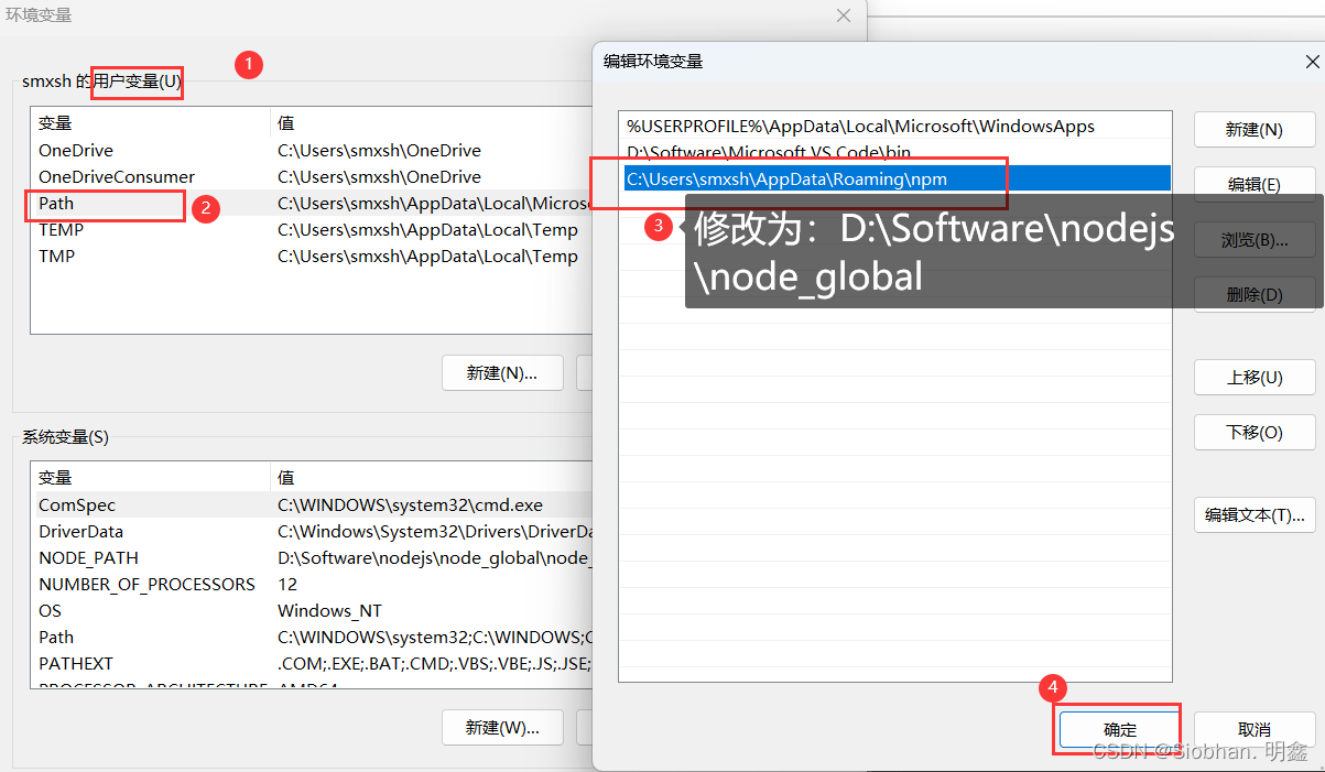 编辑用户变量(环境变量)的 path,将默认的 C 盘下 APPData\Roaming\npm 修改成 D:\Software\nodejs\node_global,点击确定