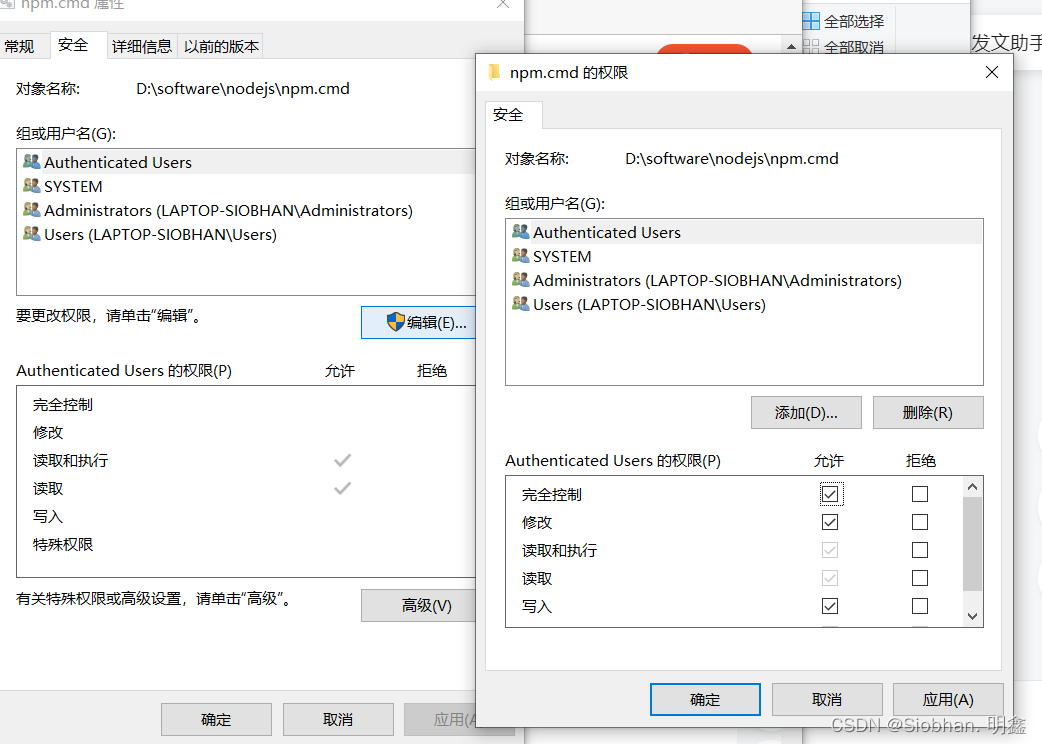 步骤: 鼠标右击【node_global】的文件夹,点击【属性】,再点击【安全】,再点击【编辑】,将不同的用户名 权限都勾上,随即点击【确定】即可,【node_cache】步骤同理。