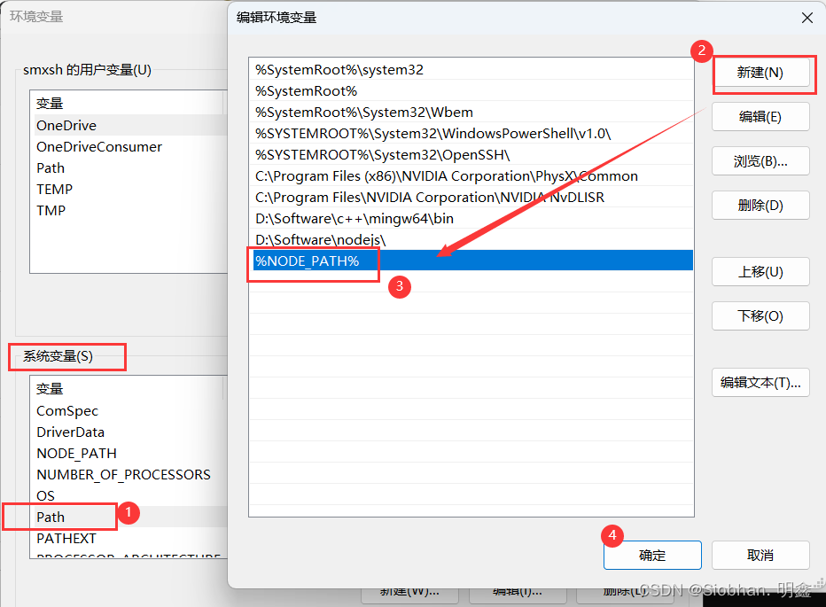 在【系统变量】中选择【Path】点击【编辑】添加【NODE_PATH】,随后一直点击【确定】