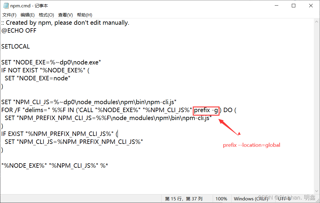 将npm.cmd文件的第12行,修改成下图样式,命令如下,可以直接粘贴,修改完保存。