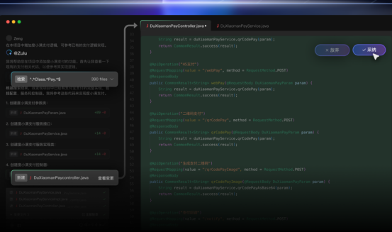 例如,上个月我和同事们在完成一个电商网站的开发过程中,需要“增加支付”模块。对于这个不算太复杂的任务,我们就直接告诉Zulu“需要给该网站增加支付功能”,Zulu就自动分析了整个网站的现状,很快找到了实现方式,并生成了接口和实现类文件,整个过程仅需1分钟,而过去这样的优化可能需要一整天。