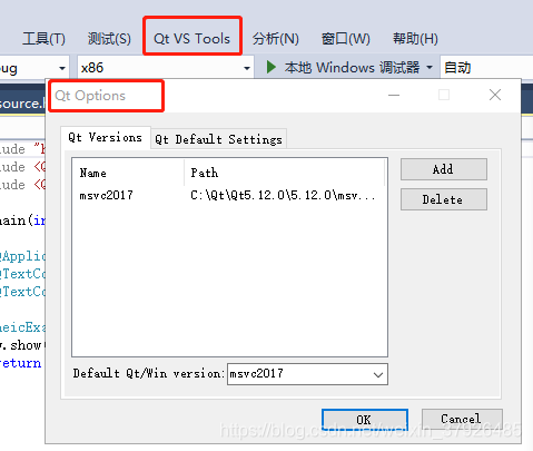安装完毕,重新启动VS2017后,选择“Qt VS Tools”菜单栏,按照下图所示,打开“Qt Options” 配置Qt Versions。