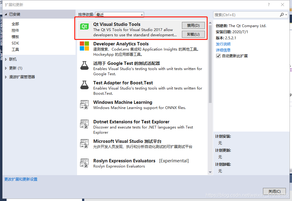 打开VS之后,找到“工具”->"扩展和更新"选项,打开之后搜索“Qt Visual Studio Tools”