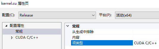 工程中加入后缀是cu的文件,右键该文件选择:属性—>常规—>项类型—>CUDA C/C++