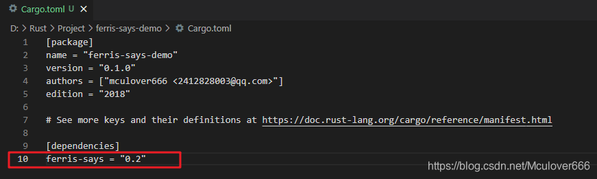 [dependencies]:区域标签,表示接下来的区域用来声明项目的依赖(creat)。