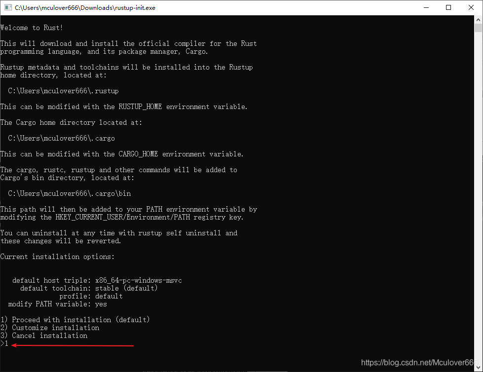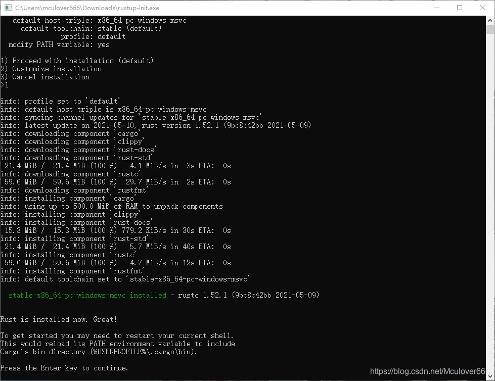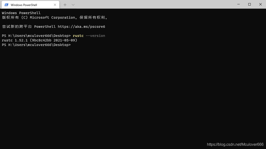 安装过程中rustup工具会将该路径自动添加到环境变量中,可以在命令行中运行该命令查看版本,如图: