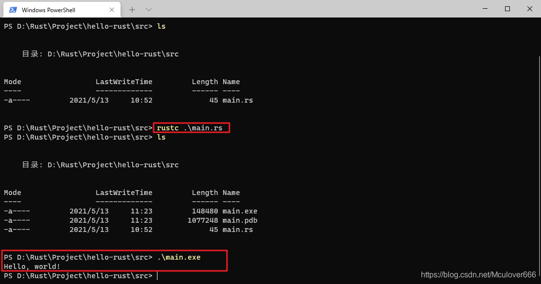 这里我们当然可以直接用rustc来编译,直接在main.rs文件所在位置打开编译器,使用rustc编译: