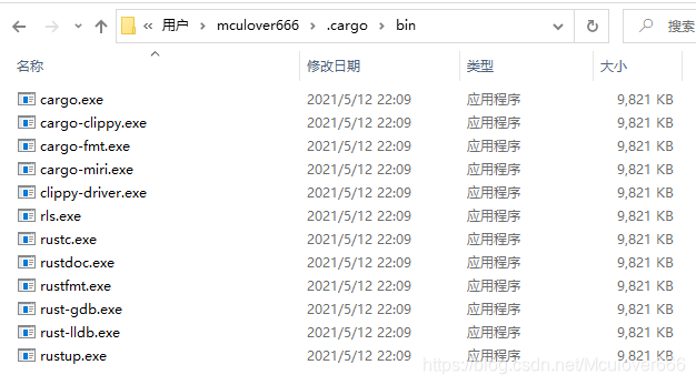 Rust开发环境会将所有工具都安装在用户目录/.cargo/bin目录中,包括rustc、cargo、rustup在内的rust工具链。
