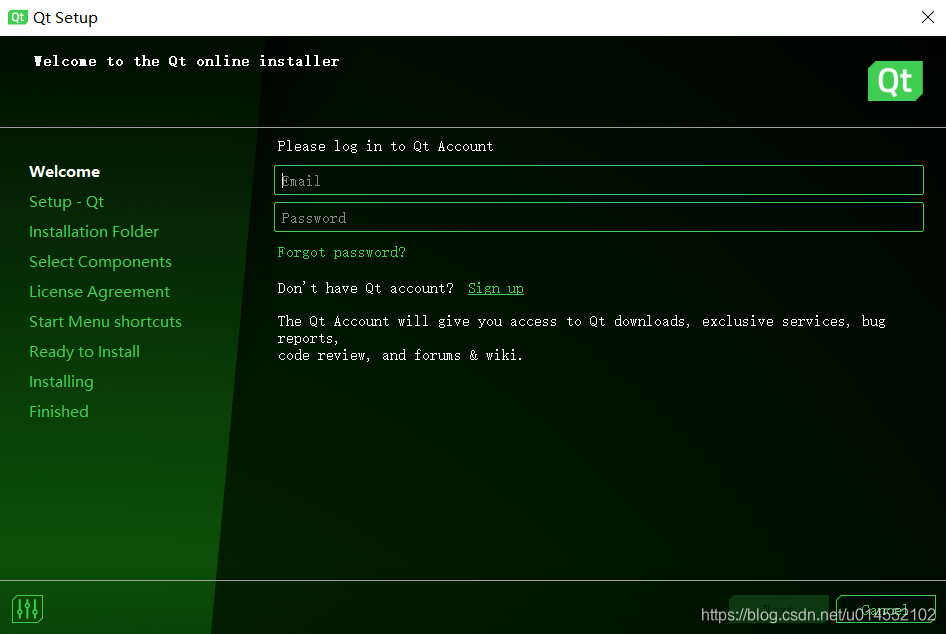 下载后运行,在下图页面输入Qt账号,如果没有账号,则注册一个。点Next。