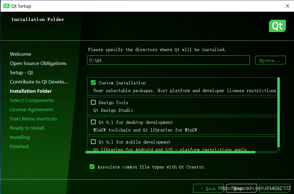 windows下可以通过Qt Creator或者windows+Qt插件来写Qt程序。下面讲述vs2019+Qt5.15.2开发环境的搭建方法。首先安装vs2019。安装完后安装Qt,打开链接:https://download.qt.io/official_releases/online_installers/,下载qt-unified-windows-x86-online.exe(从Qt5.15
