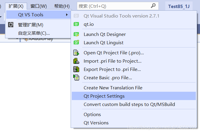 安装完后我们打开vs2019,“扩展” -> “Qt VS Tools” -> “Qt Versions”