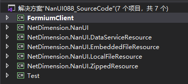 新建一个项目,将源码的 NetDimension.NanUI 文件夹复制到你的新建的项目中。这里先导入NetDimension.NanUI,是因为其他的插件代码,依赖这个程序集,在导入其他扩展程序集之前,请确保 NetDimension.NanUI 没有错误。