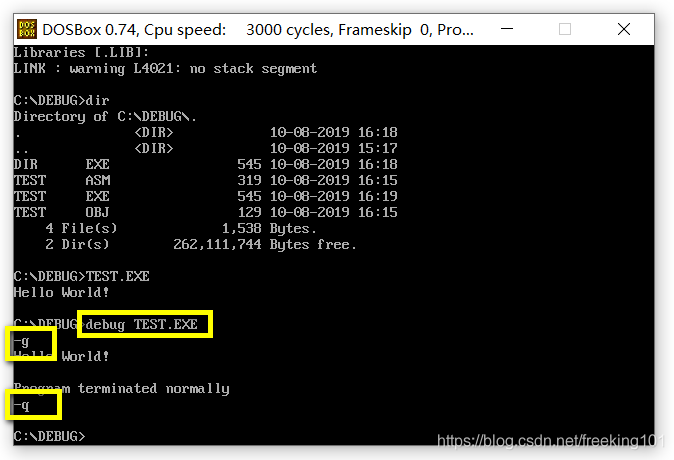 现在,打开 dosbox,输入 dir 。看看有没有 DEBUG,MASM 等文件。如果有的话就说明成功了,可以开始写汇编了。