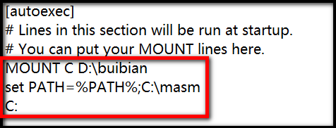将光标定位到 dosbox-0.74.conf 文件的 [autoexec] 节点(一般在该文件末尾),在文件中添加以下内容: