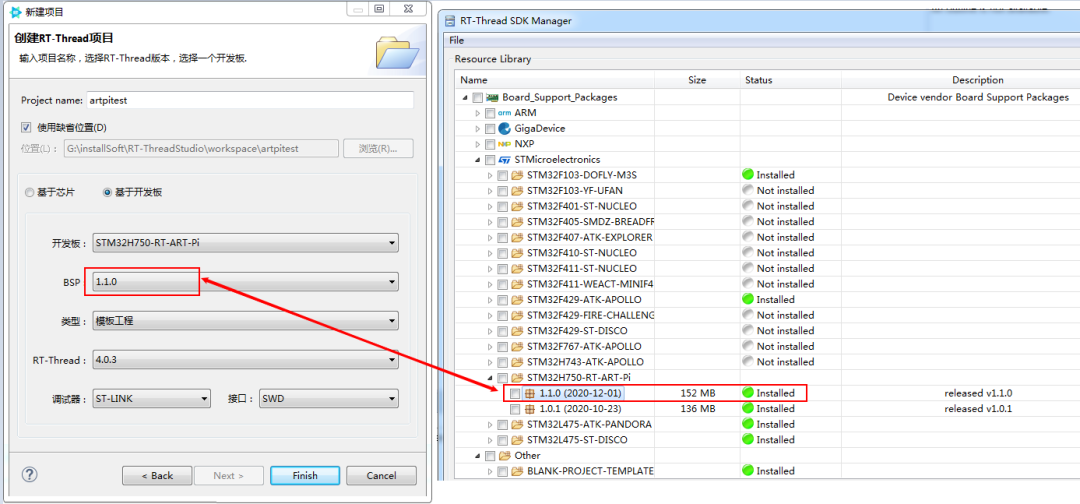 新的 SDK 更新包 V1.1.0 实现了许多新功能。在 Studio 的 SDK Manager 里安装 ART-Pi V1.1.0 新版资源包后,在新建工程时注意选择 V1.1.0 版本即可采用新版本。关于 ART-Pi 更多资料和教程可以访问 ART-Pi 官方站点获取:https://www.jlht168.com/post/m1/Jryk1eDMBdAR.html