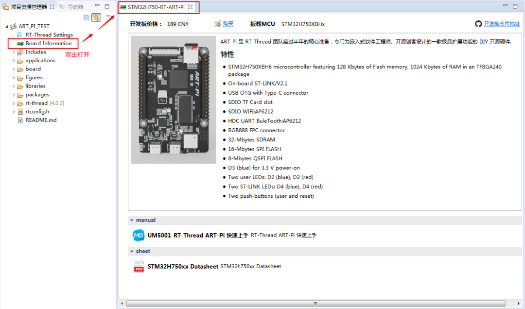 在 Studio 先前版本里,只有在创建工程的时候才可以浏览到开发板详情和开发板自带文档,创建完工程如果想再次去查找浏览一下开发板详情信息或者文档是很不方便的。现在基于开发板创建的工程,在工程内预留了一个开发板详情查看入口,随时想查看,双击它即可。