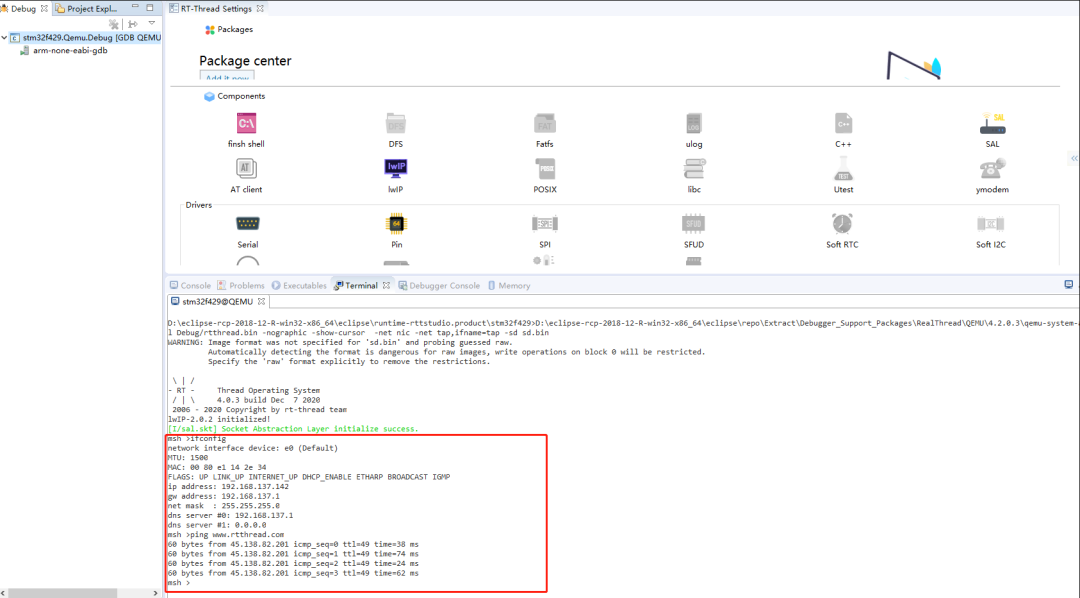 老版本 Studio 的 QEMU 仿真支持多种类型的开发板,并且支持 VEXPRESS-A9 的网络仿真,这次更新 STM32F4 的开发板也加入了 QEMU 网络仿真支持,使用者可以在没有 STM32F4 开发板的情况下进行网络功能仿真。