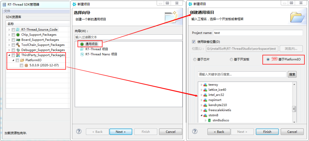PlatformIO 目前支持的 41 个平台,23 个框架,924 个开发板,222 个例程,10595 个库资源在 RT-Thread Studio 里均可选择和使用 (PlatformIO 资源包安装时间需要几分钟,需要耐心等待)。