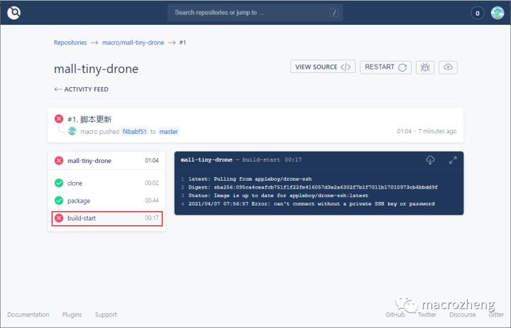 此时我们在Drone中发现其实流水线执行失败了,那是因为我们在脚本中引用了Secret中的ssh_password;