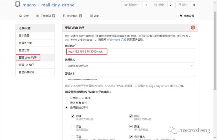 保存成功后会在Gogs中自动配置一个Web钩子,当我们推送代码到Gogs中去时,会触发这个钩子,然后执行在Drone中的流水线任务;