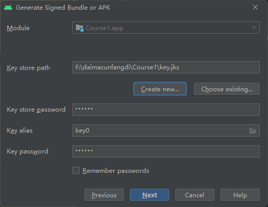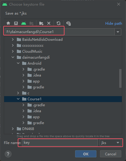 然后选择一个目录并且写个jks文件的文件名