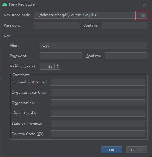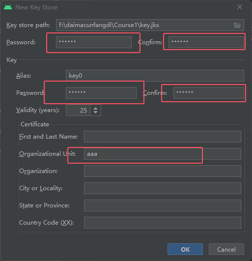 然后其它随意写,Password是密码的意思如不想每次都创建jks文件写的密码要记住,Confirm是确认密码,写完之后,然后点击OK