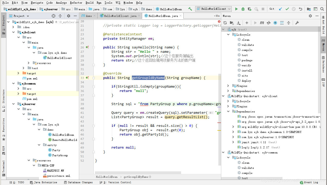 使用maven名称 mvn wildfly:deploy,将ejbserver模块部署到wildfly服务器中,idea右键运行ejbclient中的main方法,即可看到输出结果。