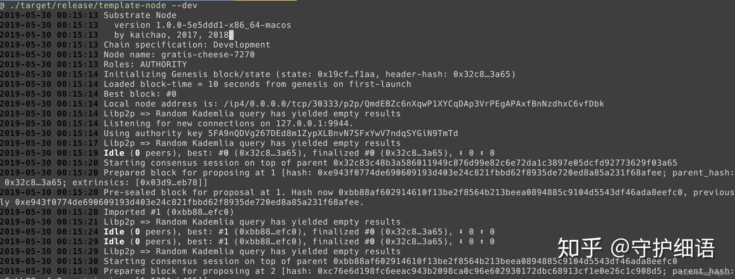 --base-path /tmp/alice:节点数据所存储的位置--chain=local:指定了节点所处的网络类型,这里local表示本地测试网络,dev表示本地开发,staging表示公开测试网络--key //Alice:模块节点程序启动时需要私钥,这里我们用了预置的Alice用户私钥--port 30333:指定p2p协议的TCP端口--telemetry-url ws://telemetry.polkadot.io:1024:将节点的监控数据发送到指定的监控服务器--validator:启用validator模式,参与区块生产--name AlicesNode:指定节点名