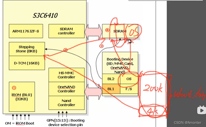 通常在内核中会固化一块片内ROM和一个SYSRAM,启动时,片内ROM的BL1(BootLoader1,第一阶段启动文件)部分先加载到核内RAM中(也有设计将此部分烧写在U-Boot的头部位置),然后判断自己在主存中还是启动设备(静态内存)Booting Device中,如果是后者,就将整个U-Boot搬运到SDRAM中,之后跳转到BL2中,加载驱动、命令行等。最后,将整个OS加载到SDRAM中,再跳转到OS部分执行。