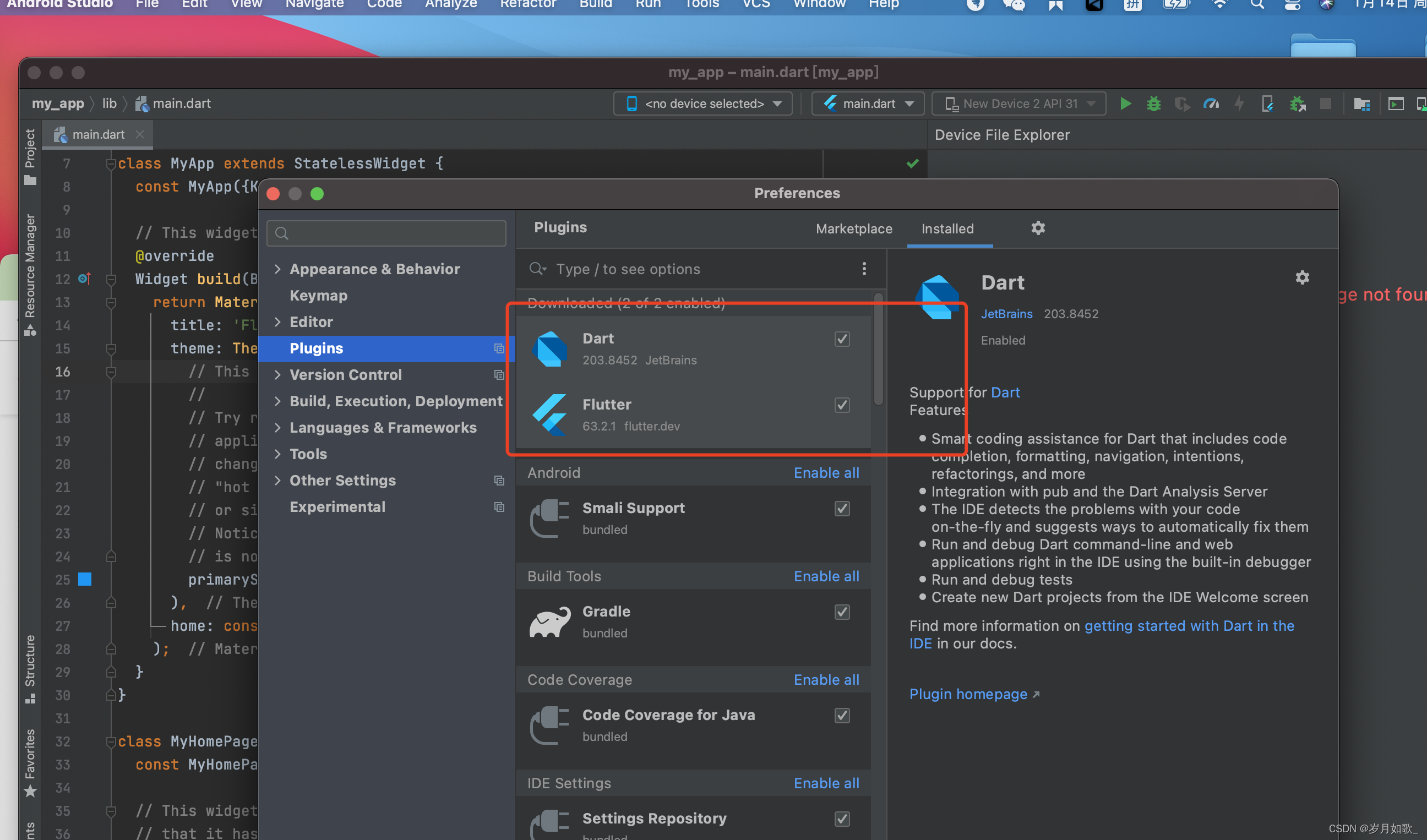 my_app的目录,包含了 Flutter 初始的应用模版,切换路径到这个目录内:$ cd my_app -