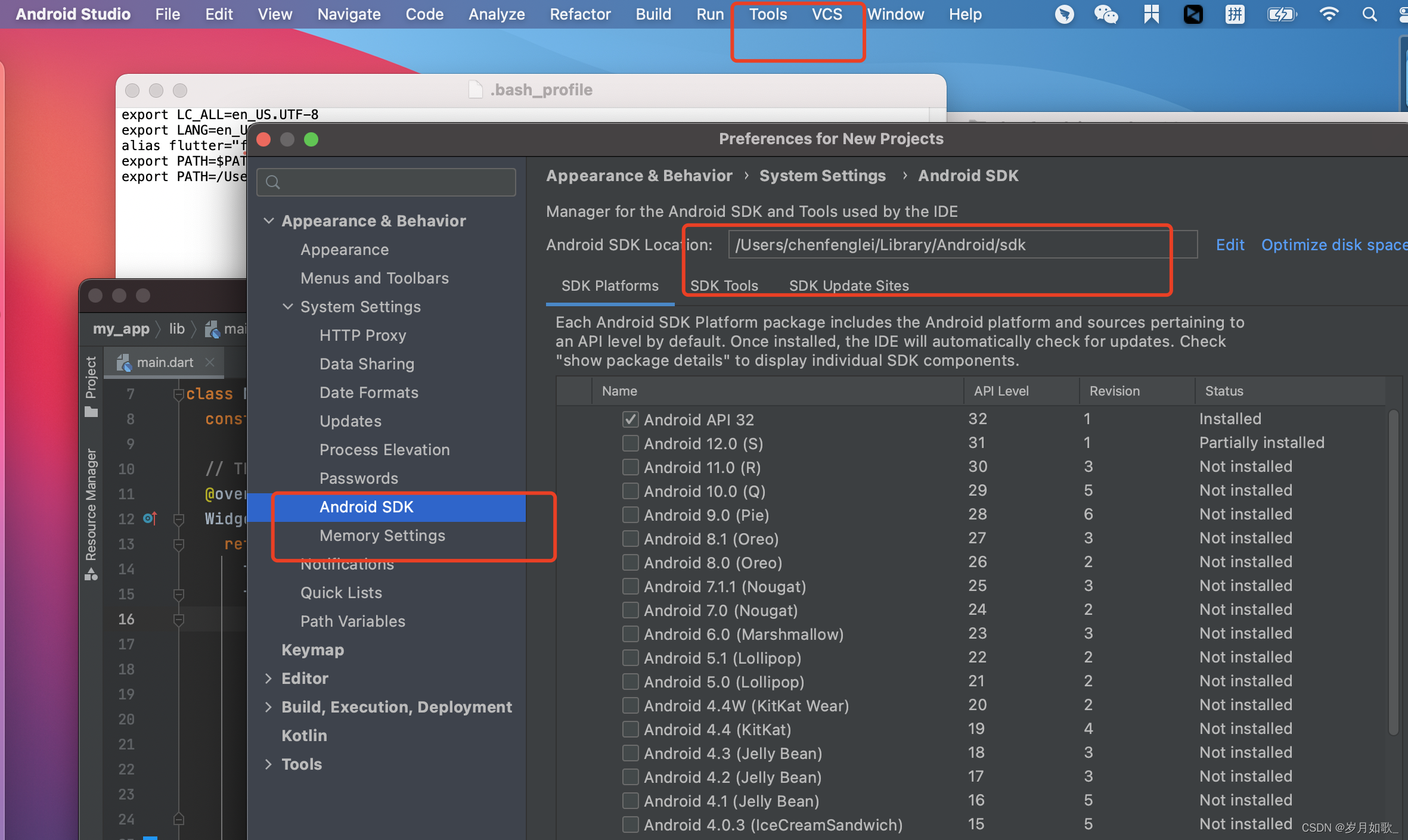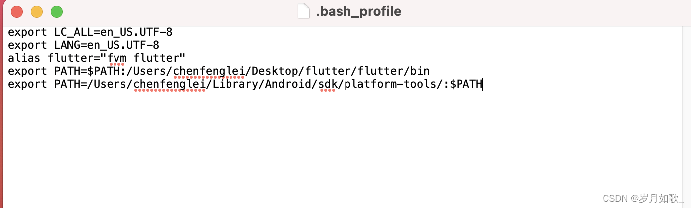 准备工作1、下载flutter sdk2、安装xcode、安装Android Studio3、安装Homebrew ,安装fvm,anz配置1、环境变量配置打开终端查看 ls -a1 打开. open .bash_profile 插入环境变量 保存 source .bash_profile2 如图 : flutter的安装地址 ,android sdk的安装地址 (软件Android Studio