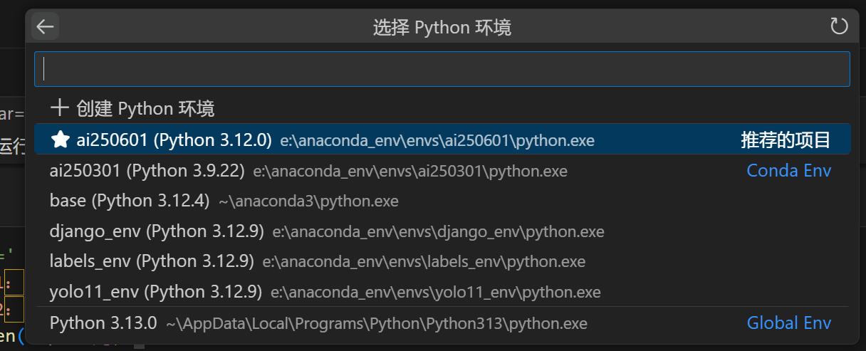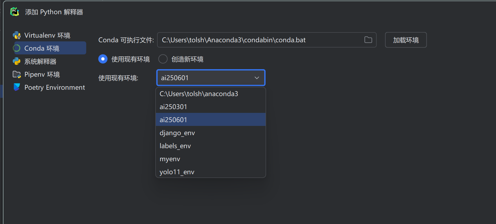 在列表中选择之前创建的 conda 环境中的 Python 解释器