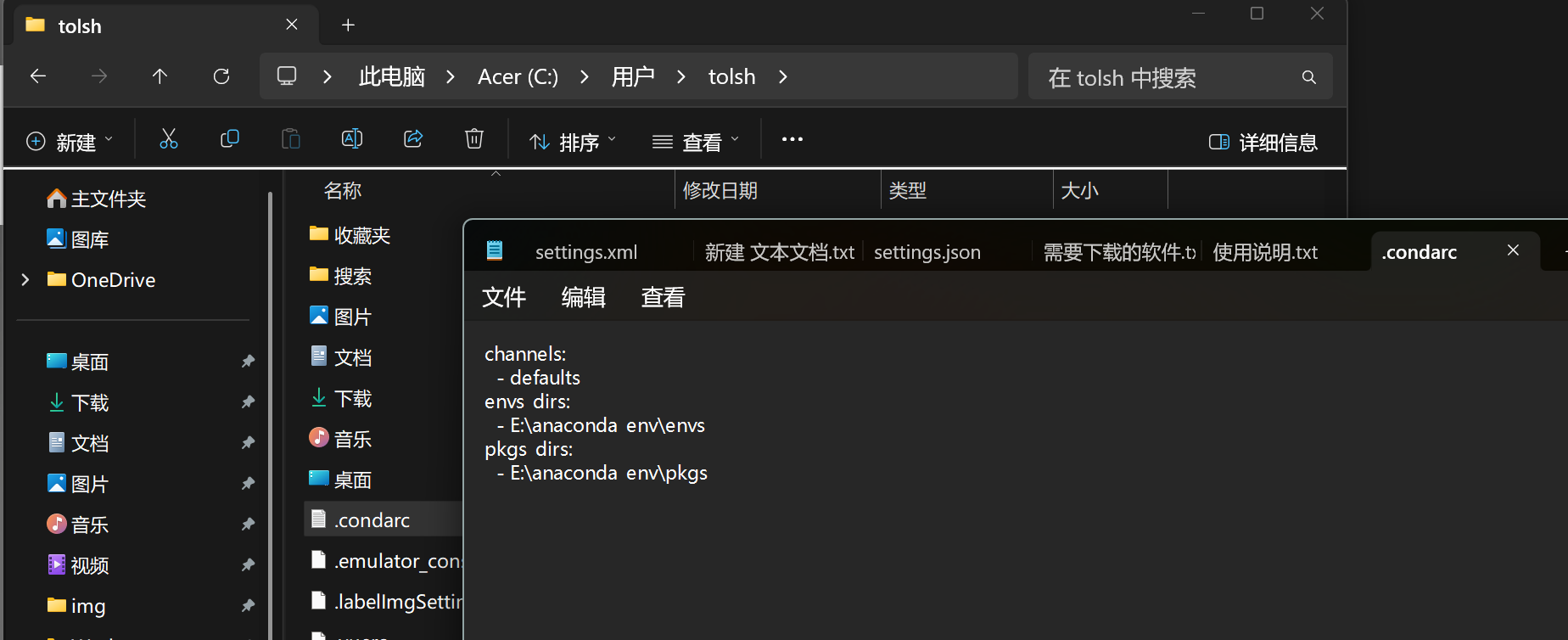 先找到C盘下用户目录下的主机名文件夹下的.condarc文件,打开,修改如下: