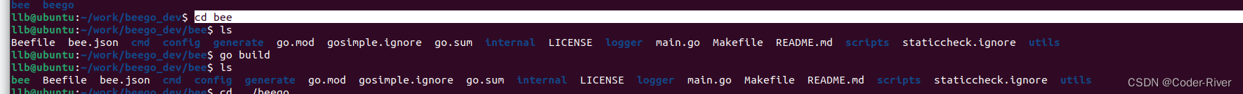 然后编译出bee这个构建beego工程的工具,由于下载bee的源码里已经有了go.mod,所以在go build的时候会自动下载一些build的依赖包