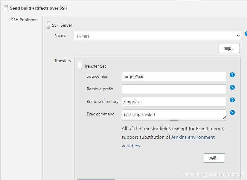 选择 Send build artifacts over SSH,直接把打包好的 jar 包到 发送到 部署服务器