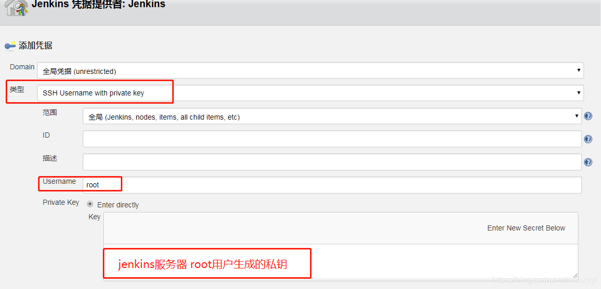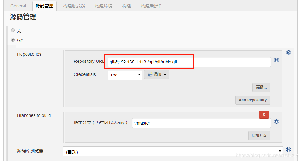 注意我这里的Git仓库服务器是自建的,客户端可以通过SSH方式访问,这里 Credentials 添加一个新的凭据