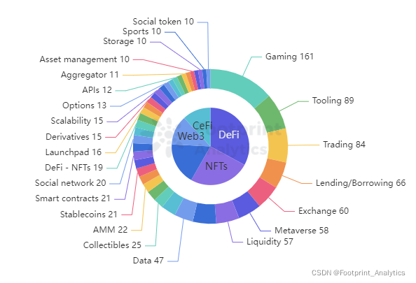 相比于 2020 年分布更集中在 DeFi、CeFi 以及基础设施领域,可以看出,2021 的区块链世界大大丰富了起来。