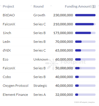 项目上来看,DeFi 项目融资数额前三名为去中心化自治组织 BitDAO、资产交易平台 FalconX 以及去中心化聚合交易所 1inch。