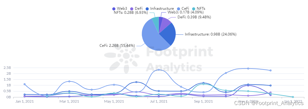 2021 年,DeFi 领域投资总额为 145 亿,在金额上绝对碾压其他赛道。全年 12 个月中,最高为 11 月的 24 亿,可见人们对服务稳定、机制齐全的 CeFi 越来越信任。