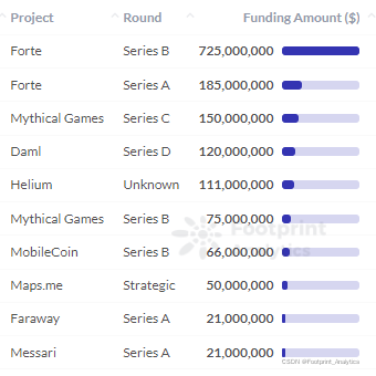 从项目融资额上来看,为游戏出版商提供区块链解决方案的领先公司 Forte、区块链游戏 Mythical Games 以及智能合约编程语言 Daml 尤为突出。
