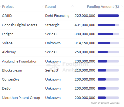 从融资额来看,金额最高的项目为自助矿工 GRIID、挖矿公司 Genesis Digital Assets 以及加密硬件钱包 Ledger。