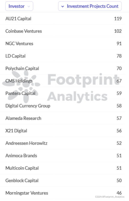 Footprint Analytics - Ranking of the project number by investment institutions