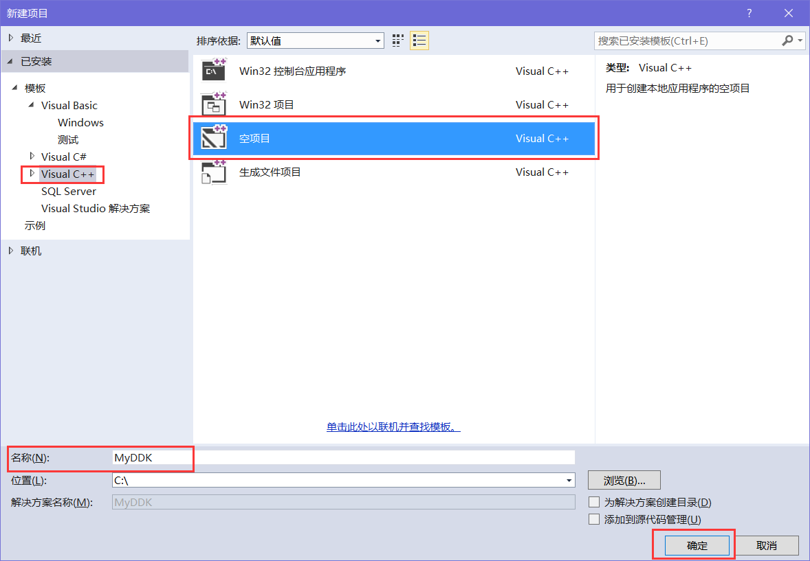 1.这里直接把我提取的WinDDK.zip文件解压缩到C盘根目录下,然后打开Visual Studio 开发工具,按下【Ctrl+Shift+N】新建空项目并输入项目名称为【MyDDK】即可。