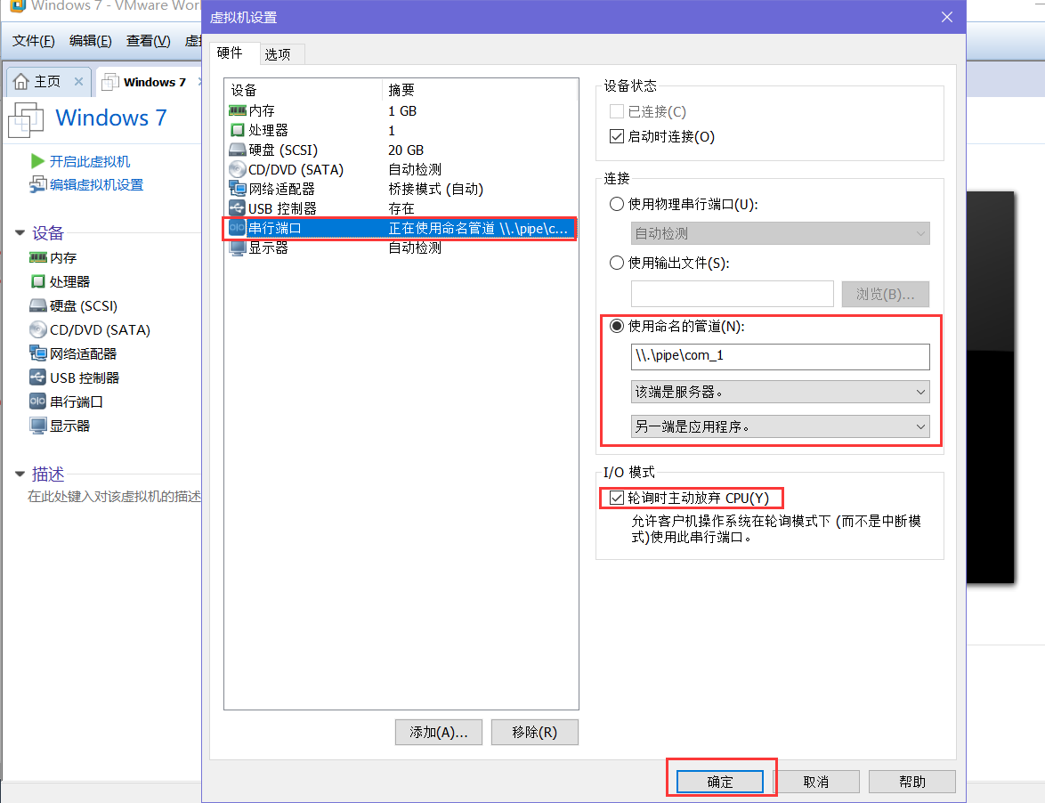 参数配置:使用命名管道->\.\pipe\com_1->该端是服务器另一端是应用程序->轮询时主动放弃CPU