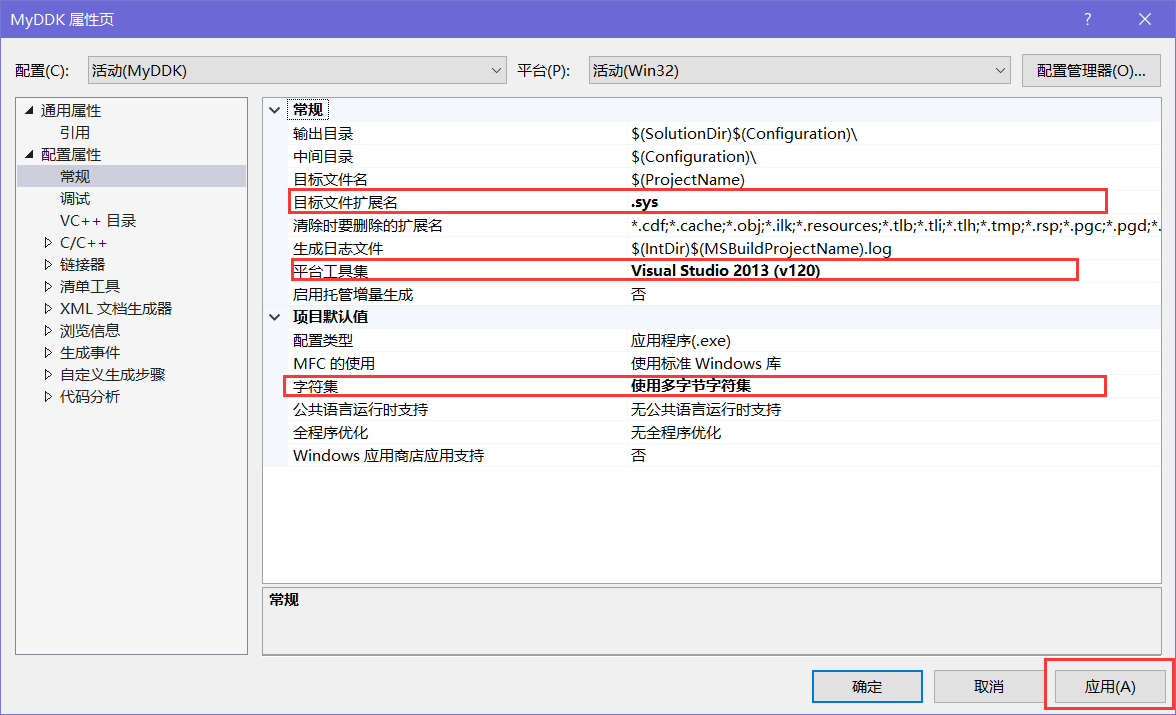 4.接着修改一下配置属性中的常规属性,点击菜单栏中的调试,选择【MyDDK属性】->【配置】->【常规】 -> 修改以下几处。