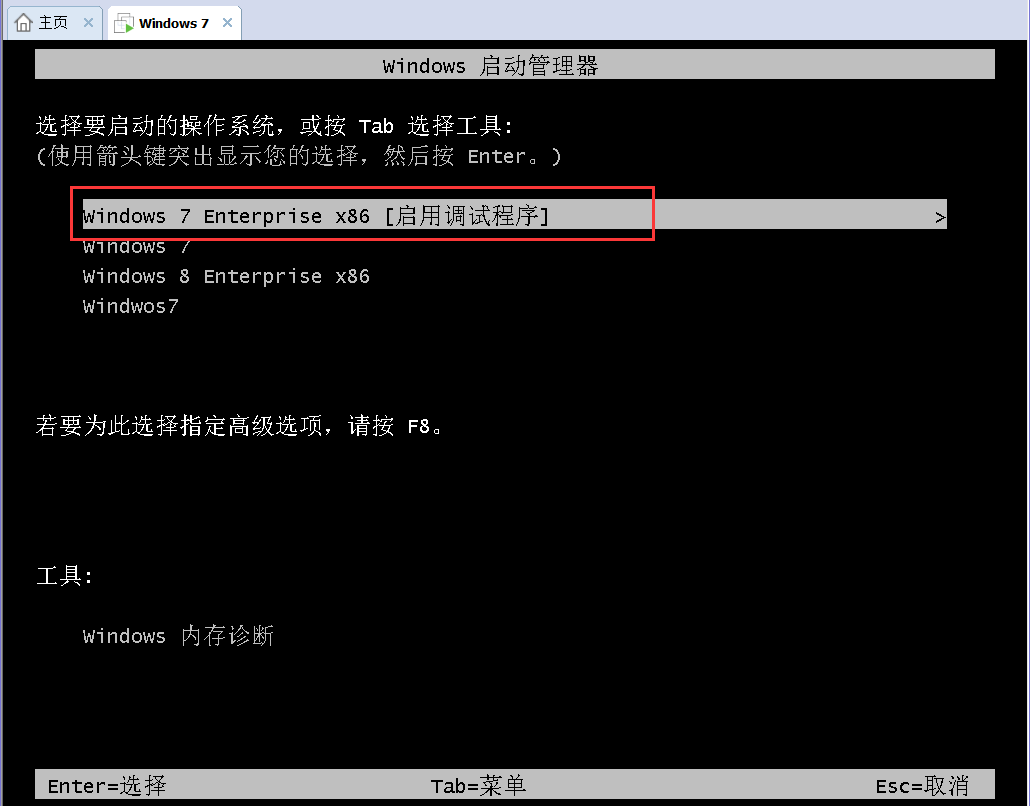 4.配置完成后,重新启动系统,在开机的时候选择Windows7 [启用调试程序]则系统会黑屏,说明已经正常进入调试模式了。