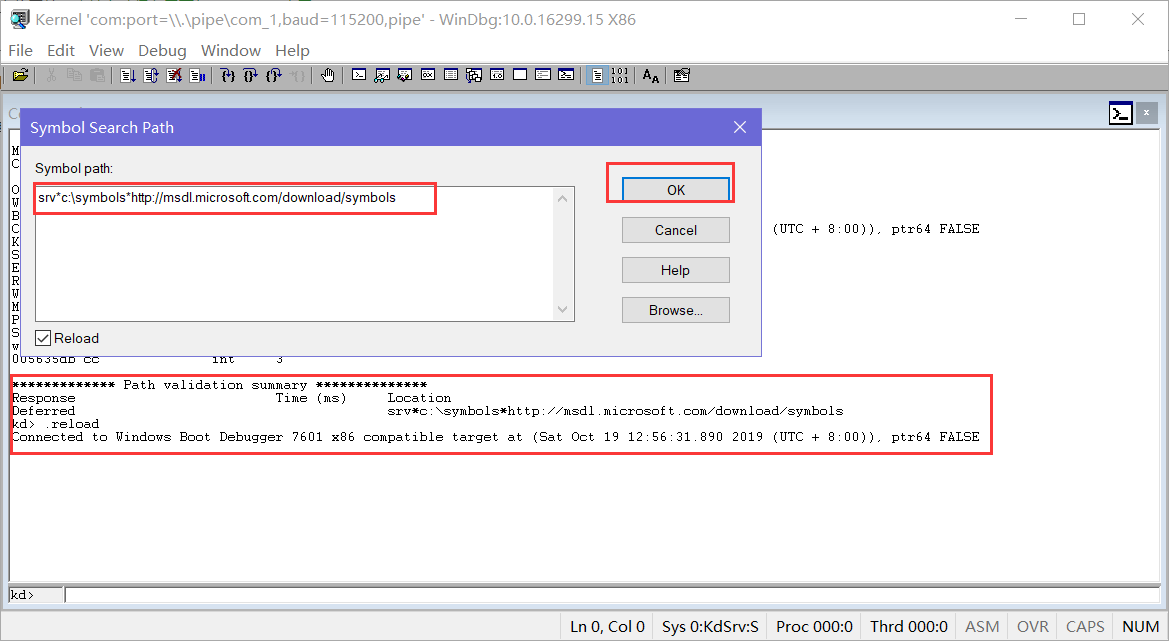 为了方便调试,可以通过【File菜单】加载符号文件,也可以按下【Ctrl+S】并输入命令 srvc:\symbolsSymbol information 自动下载符号保存到C盘下。