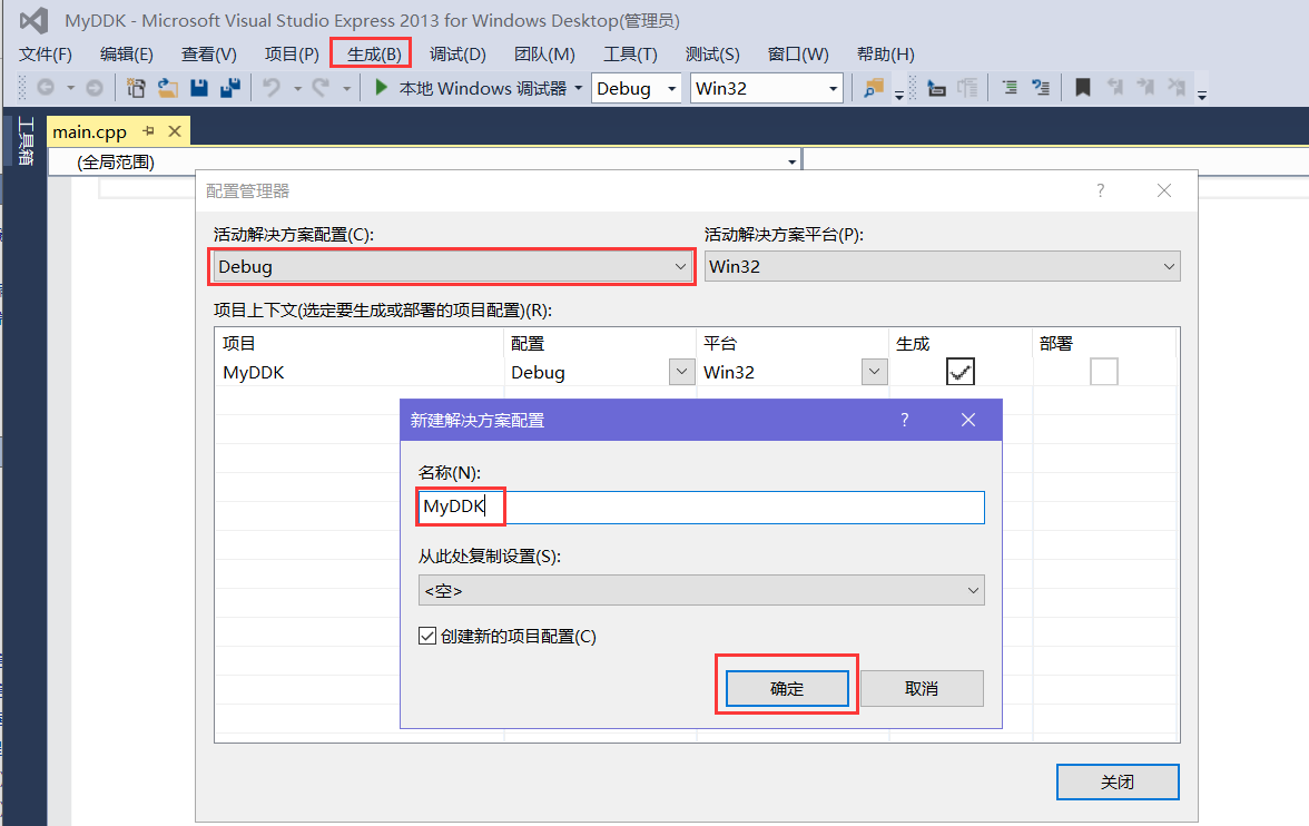 3.接着我们需要修改一下配置管理器,添加自定义配置管理,选择【生成】->【配置管理器】->【新建】,此处我们命名为【MyDDK】即可。