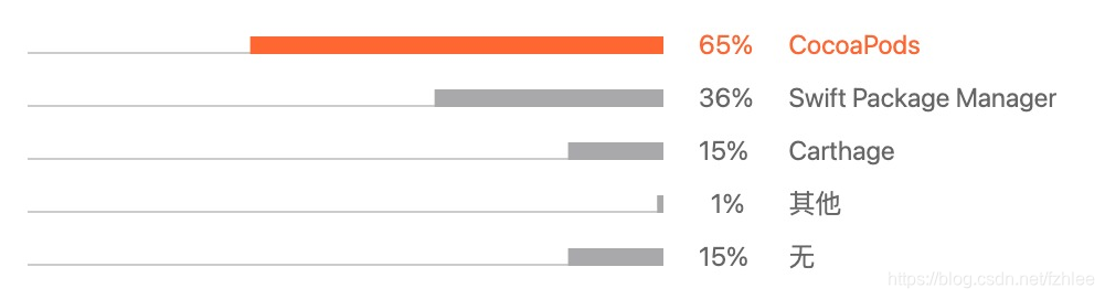 CocoaPods 的份额略微下降(下降 6%),Swift Package Manager 吸收了 CocoaPods 流失的用户,它的份额在过去一年上升了 8%。